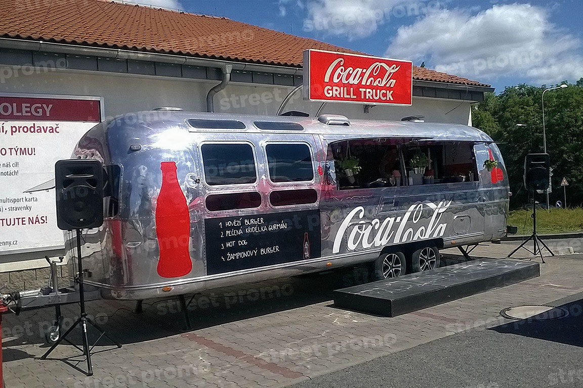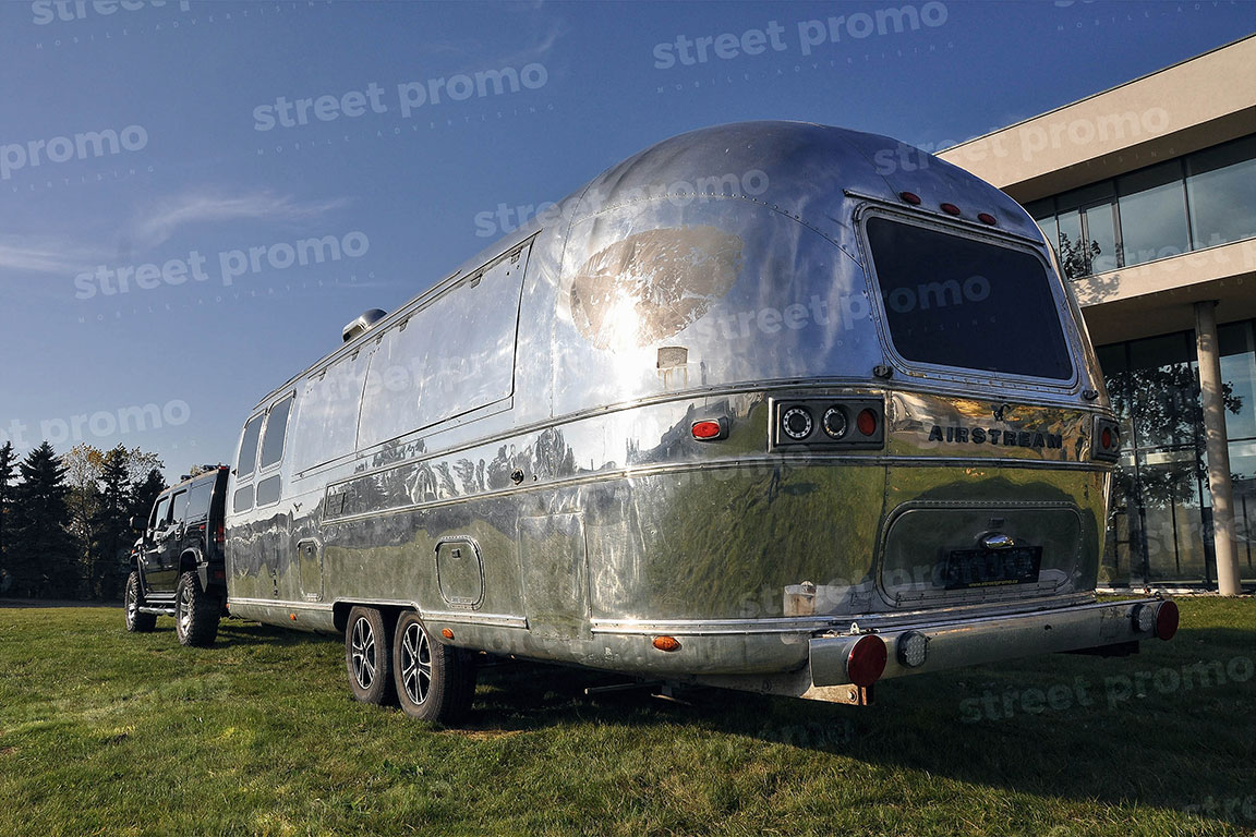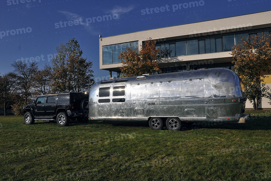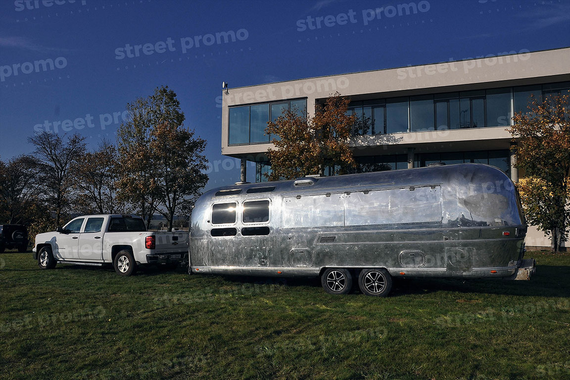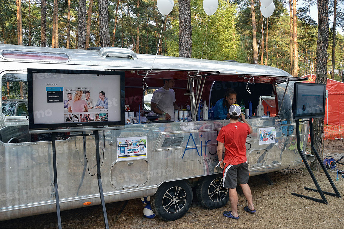 Americký karavan Airstream v úpravě na mobilní bar nebo prodejní stánek. Celková délka přívěsu je 7,5m a boční stěna je opatřena výklopným dvojoknem v délce 4 metry. Z Airstreamu tak lze pohodlně prodávat produkty či samplovat vzorky. Vnitřní vybavení – osvětlení, rozvody el. energie, lednice, nerezové stoly, dřezy, odpadní nádrž, ozvučení. Využití Airstream baru je vhodné pro hudební festivaly, roadshow a gastronomické akce.