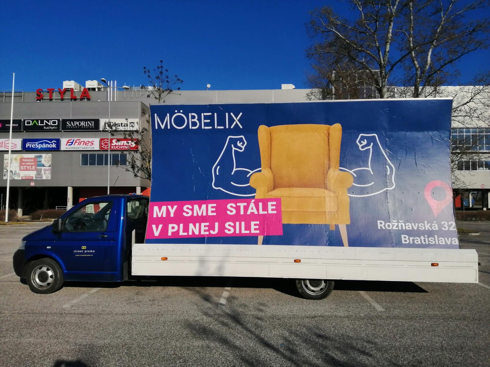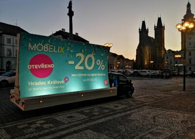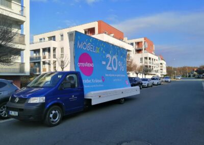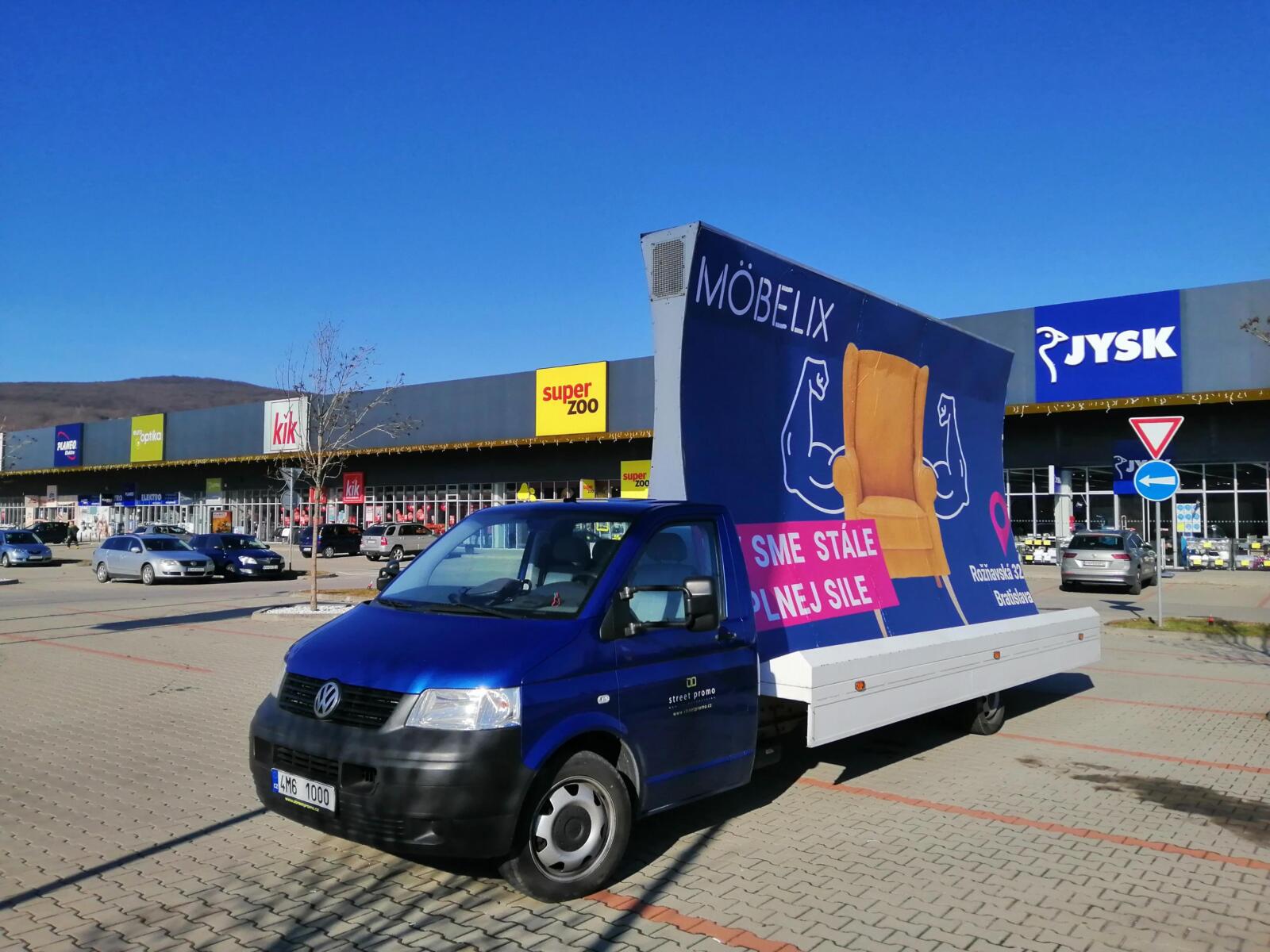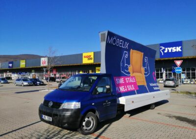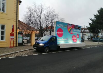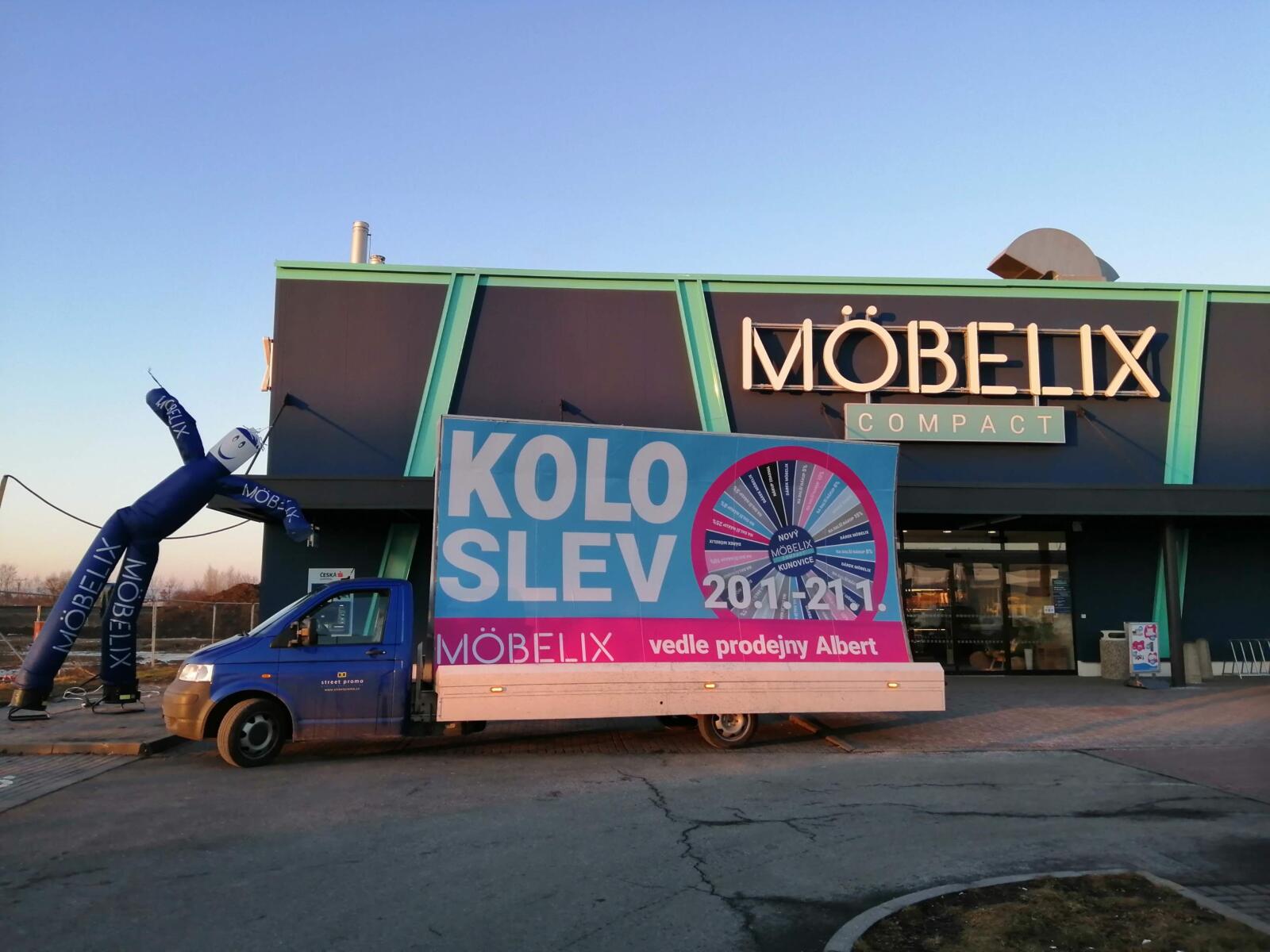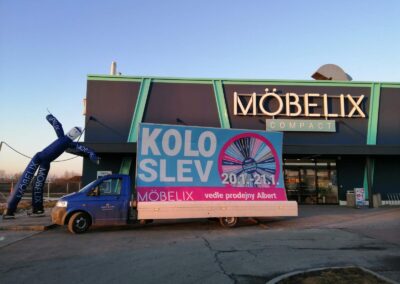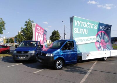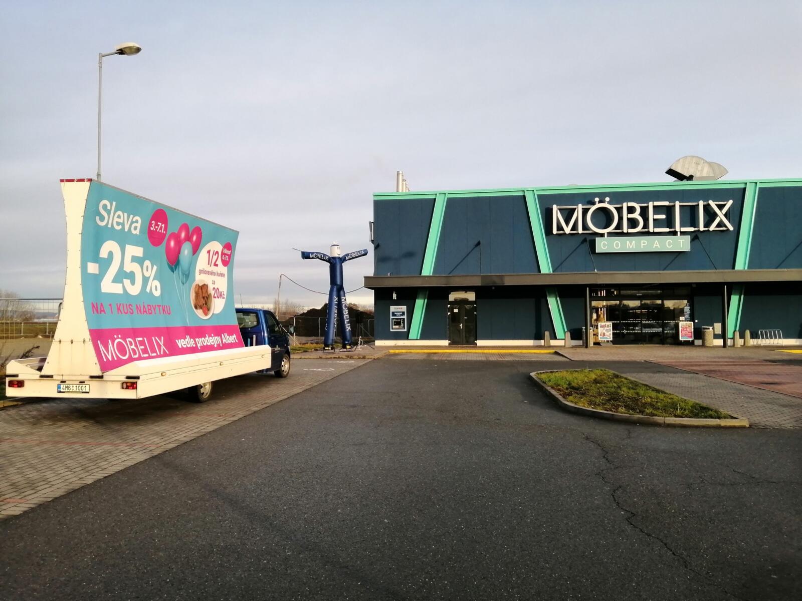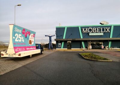 Pravidelné výjezdy konkávních aut pro prodejny Möbelix v Česku a na Slovensku upozorňují na otevření nových prodejen, slevové akce a prodej zboží, které je aktuální v akční nabídce.