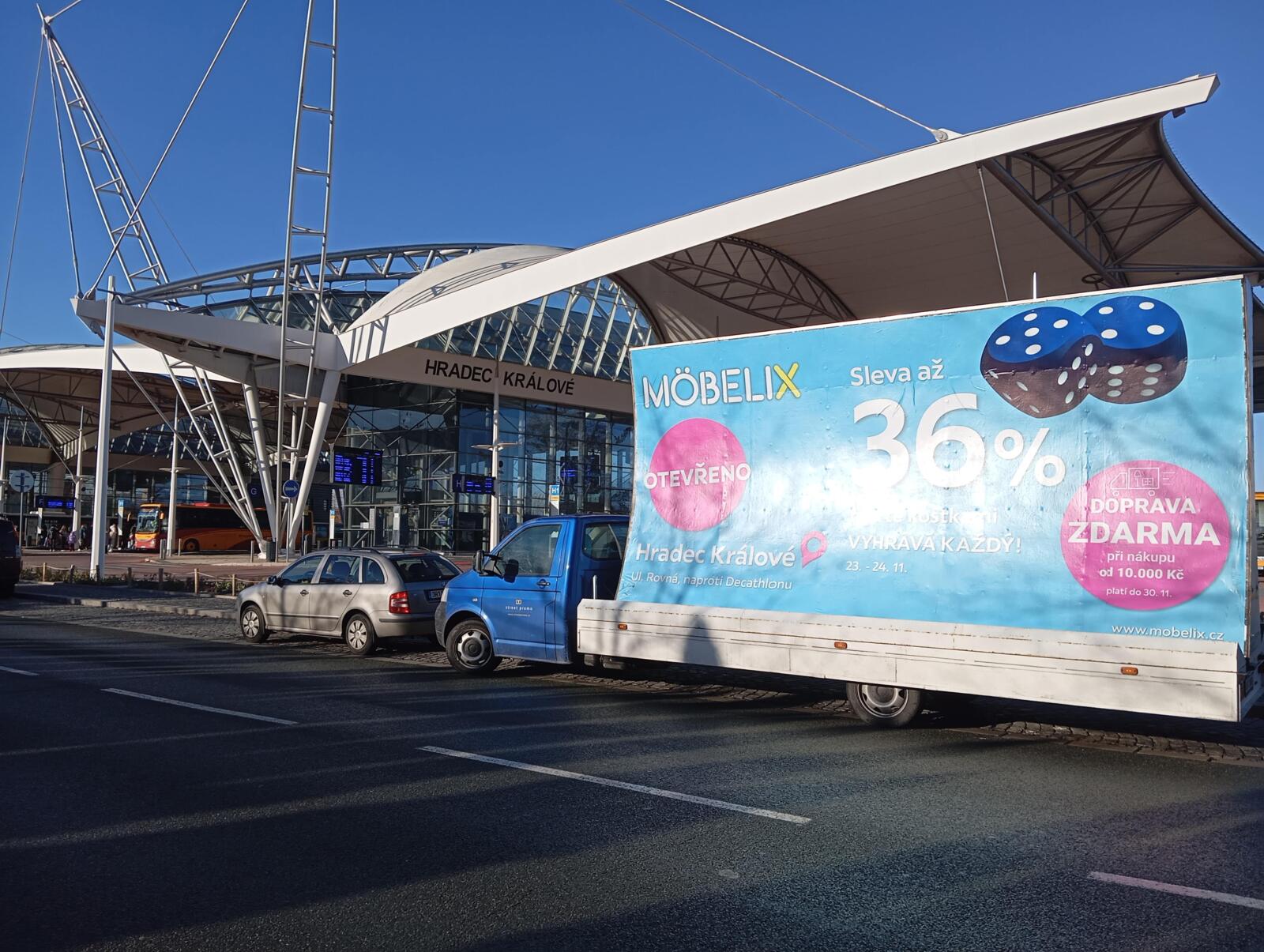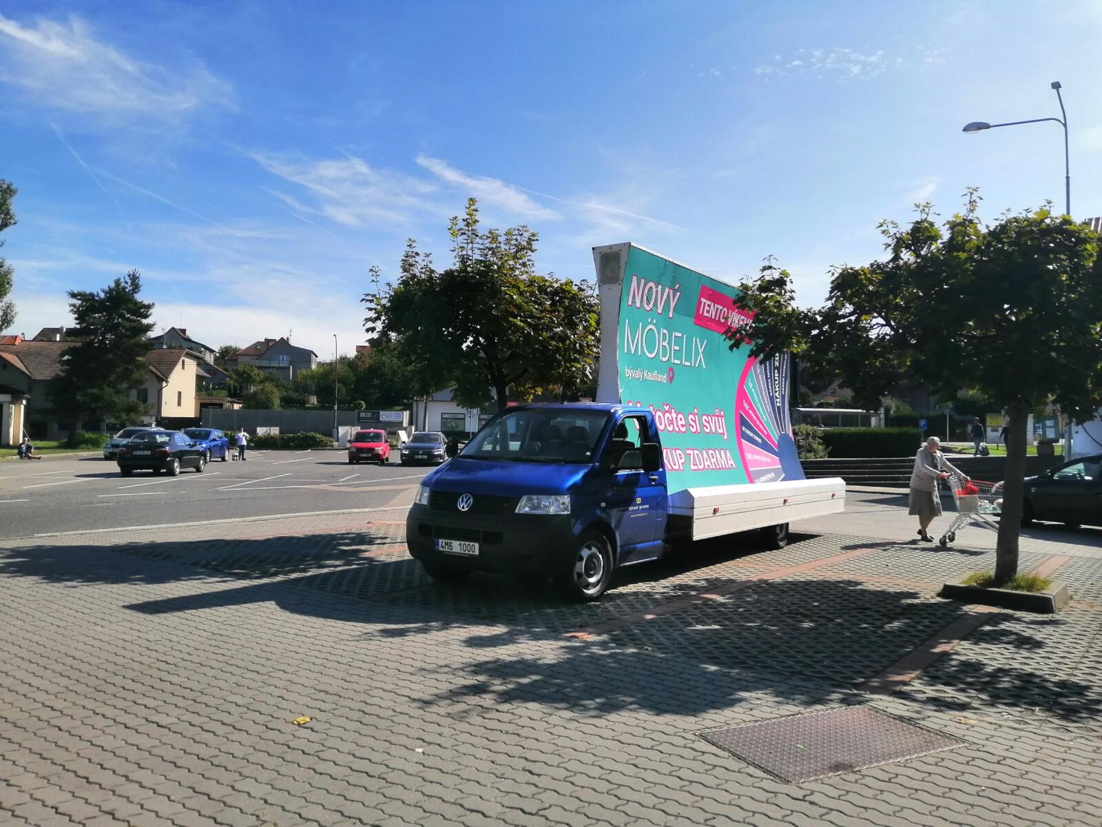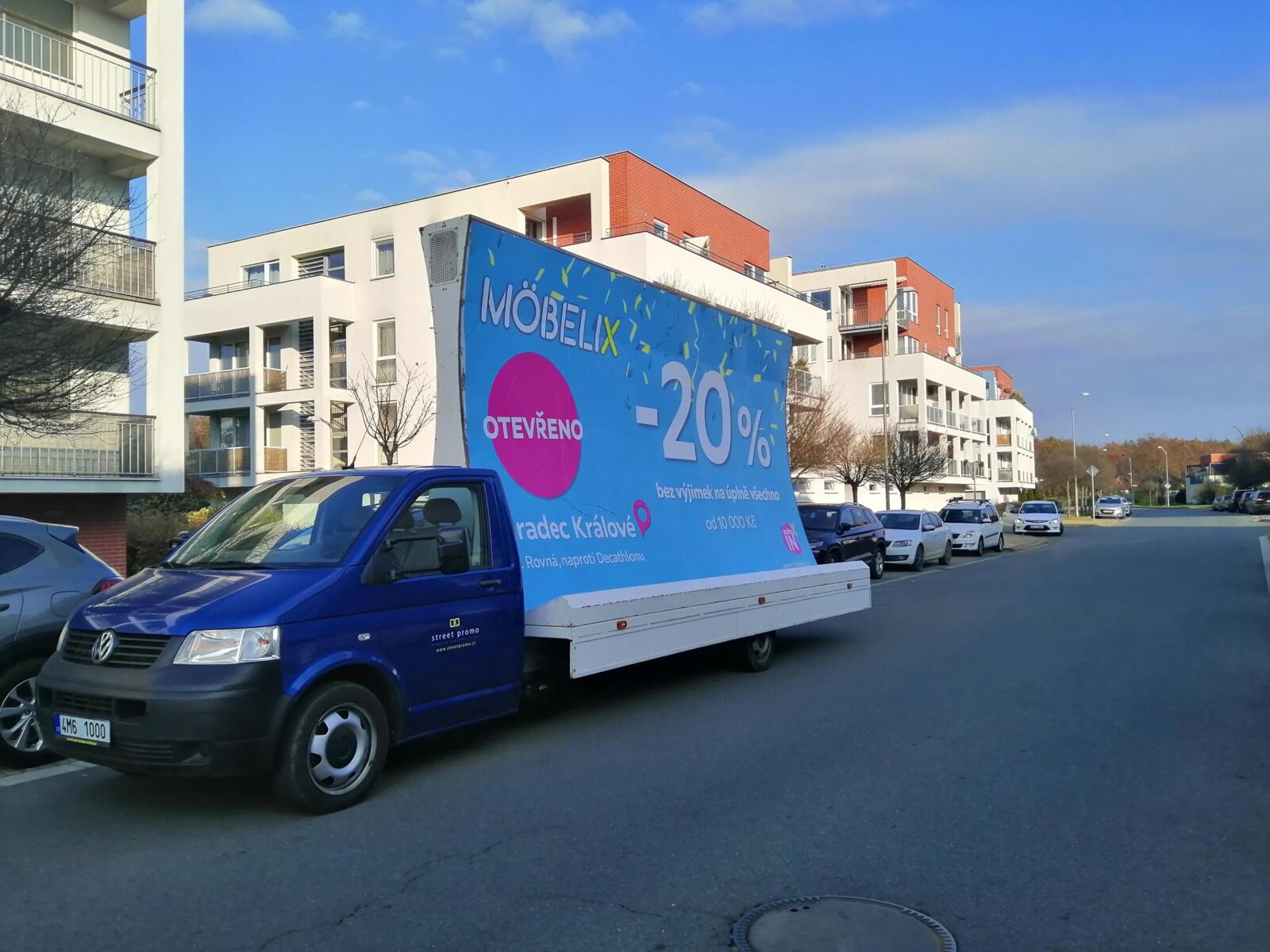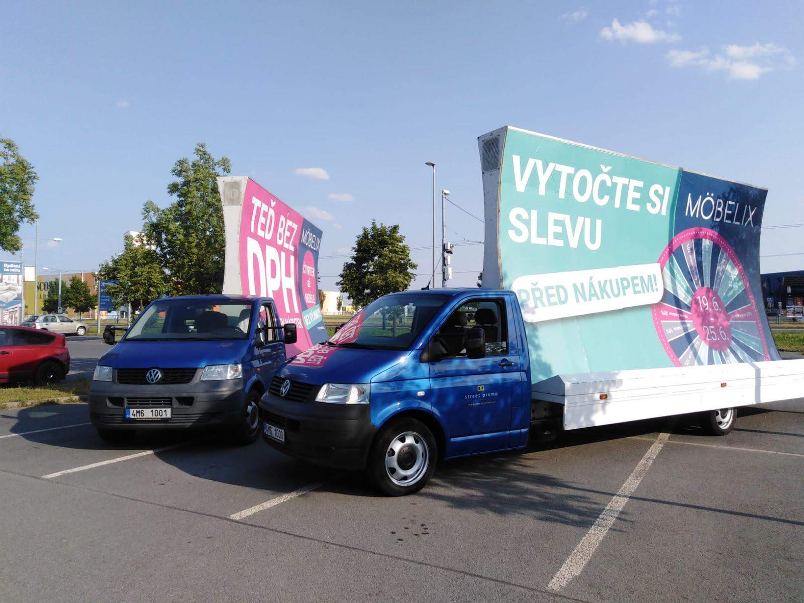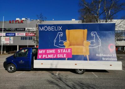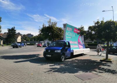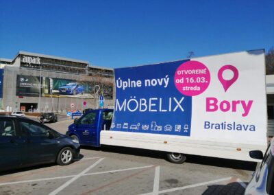 Pravidelné výjezdy konkávních aut pro prodejny Möbelix v Česku a na Slovensku upozorňují na otevření nových prodejen, slevové akce a prodej zboží, které je aktuální v akční nabídce.