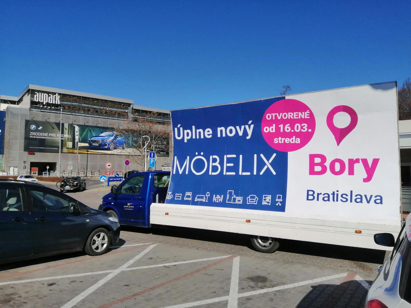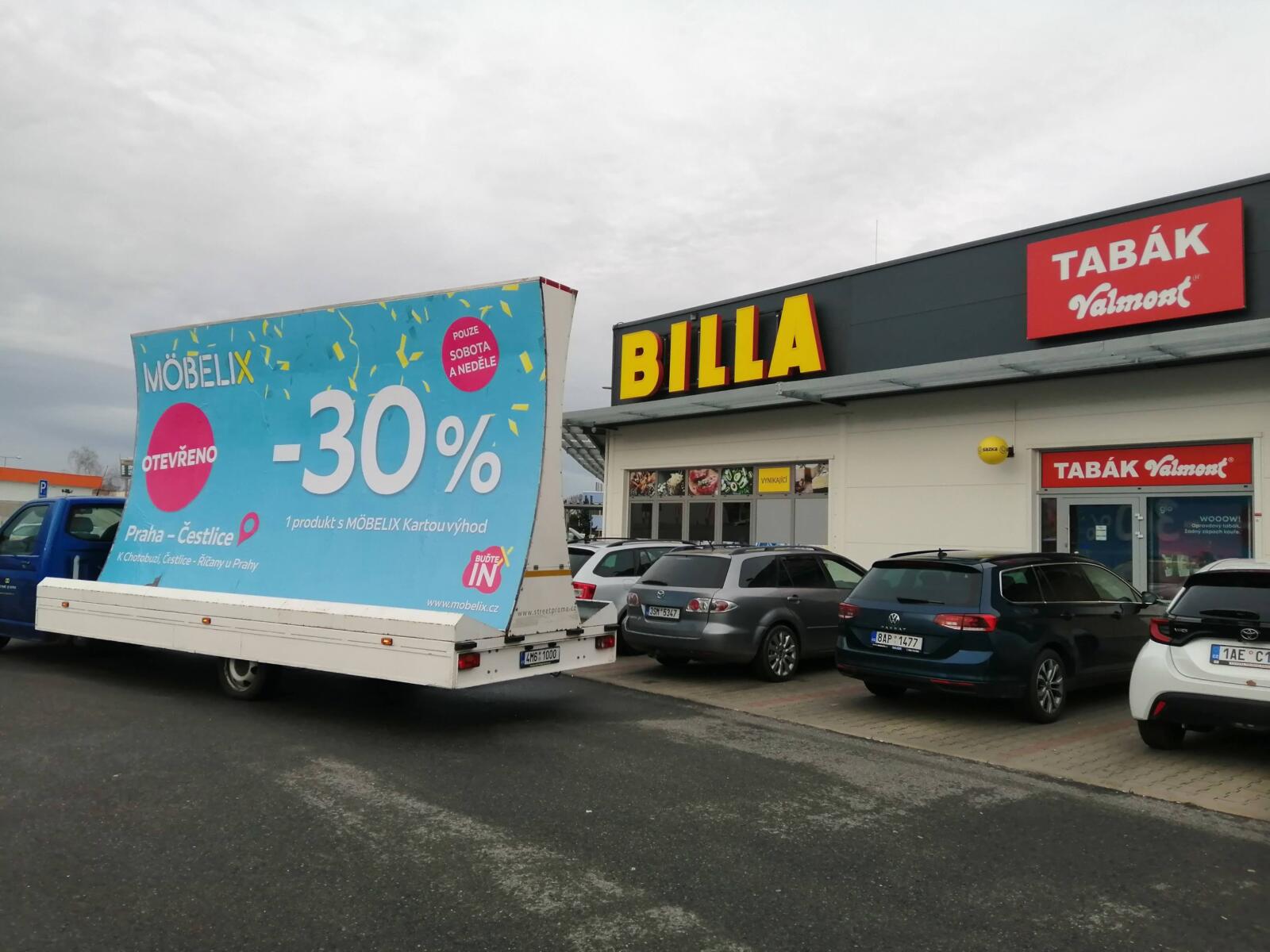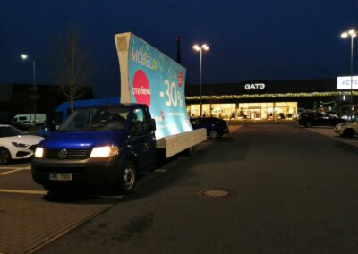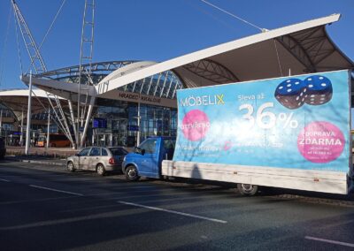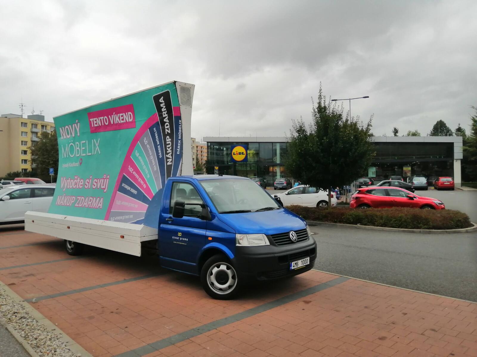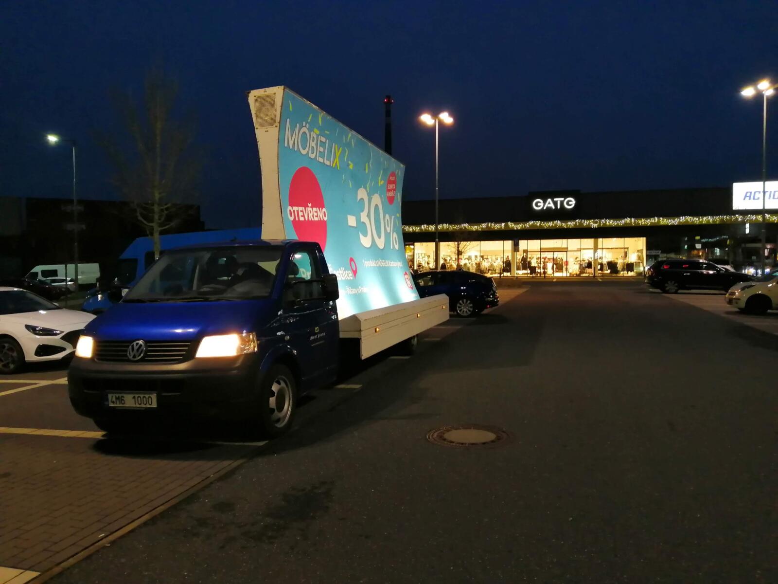 Pravidelné výjezdy konkávních aut pro prodejny Möbelix v Česku a na Slovensku upozorňují na otevření nových prodejen, slevové akce a prodej zboží, které je aktuální v akční nabídce.