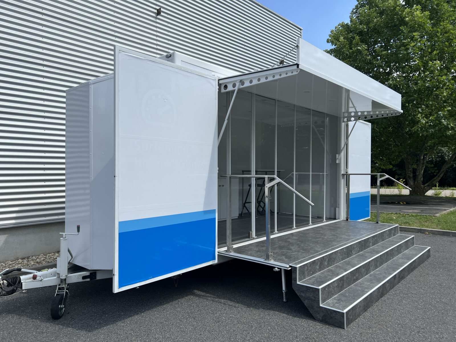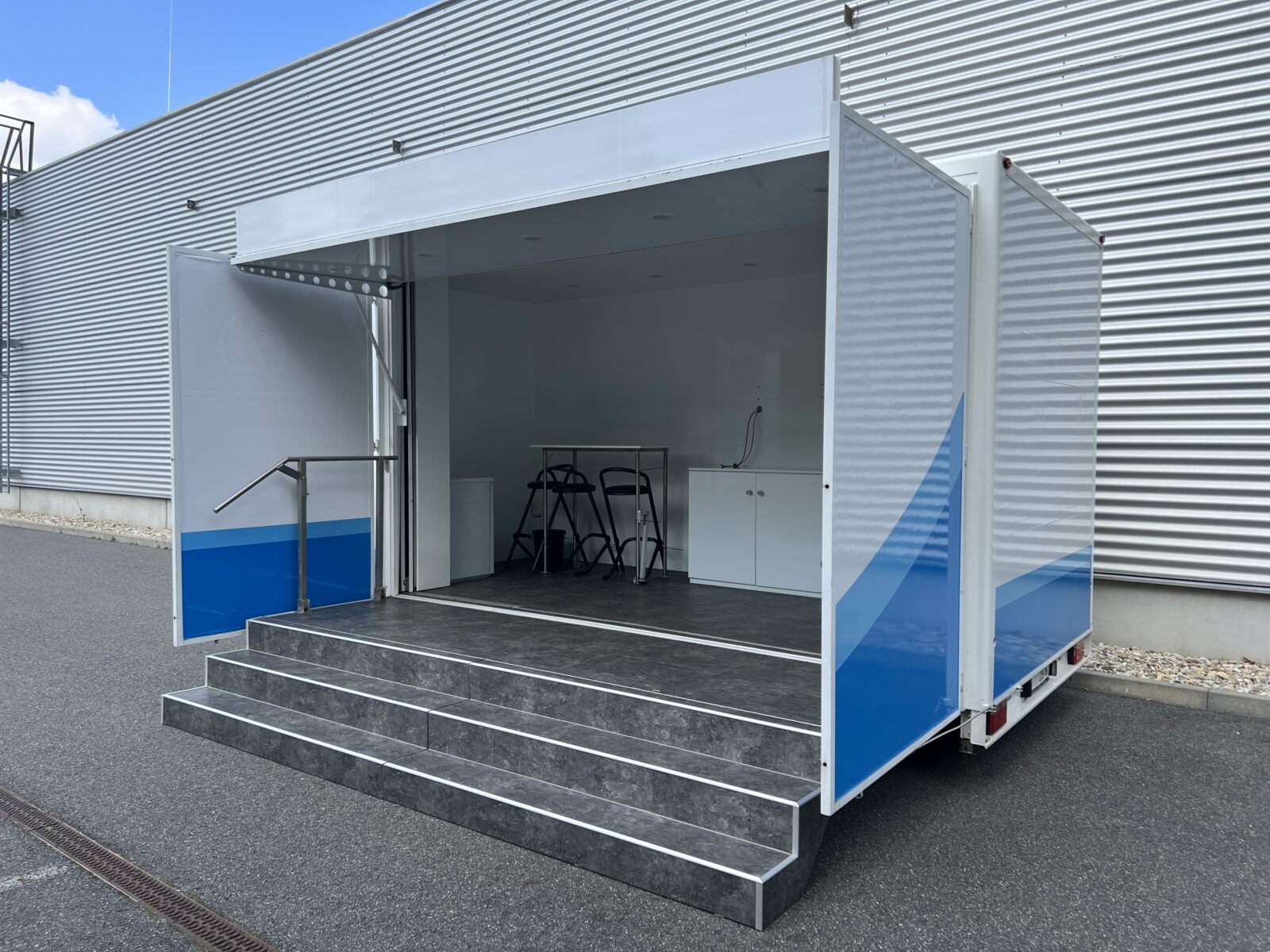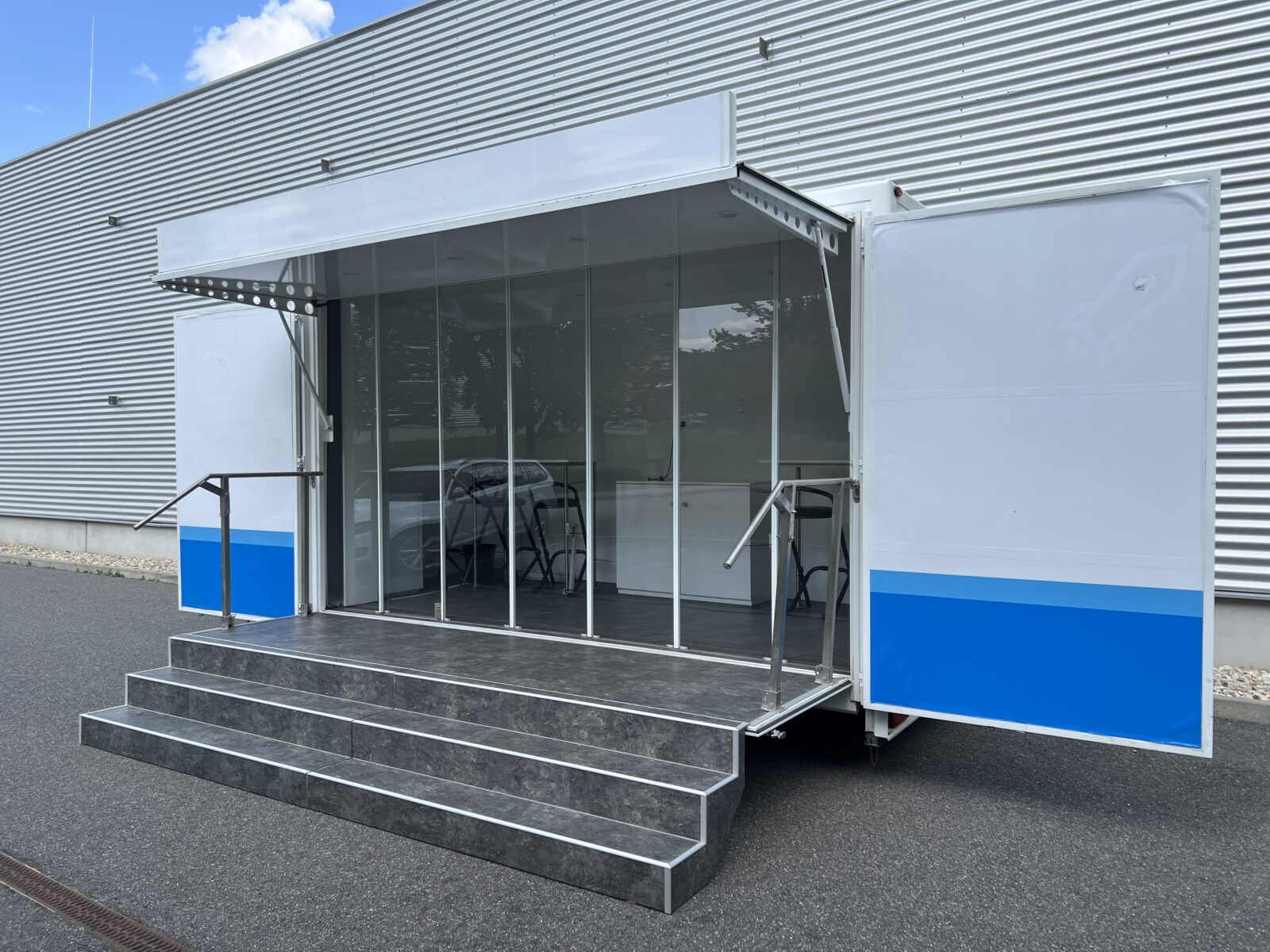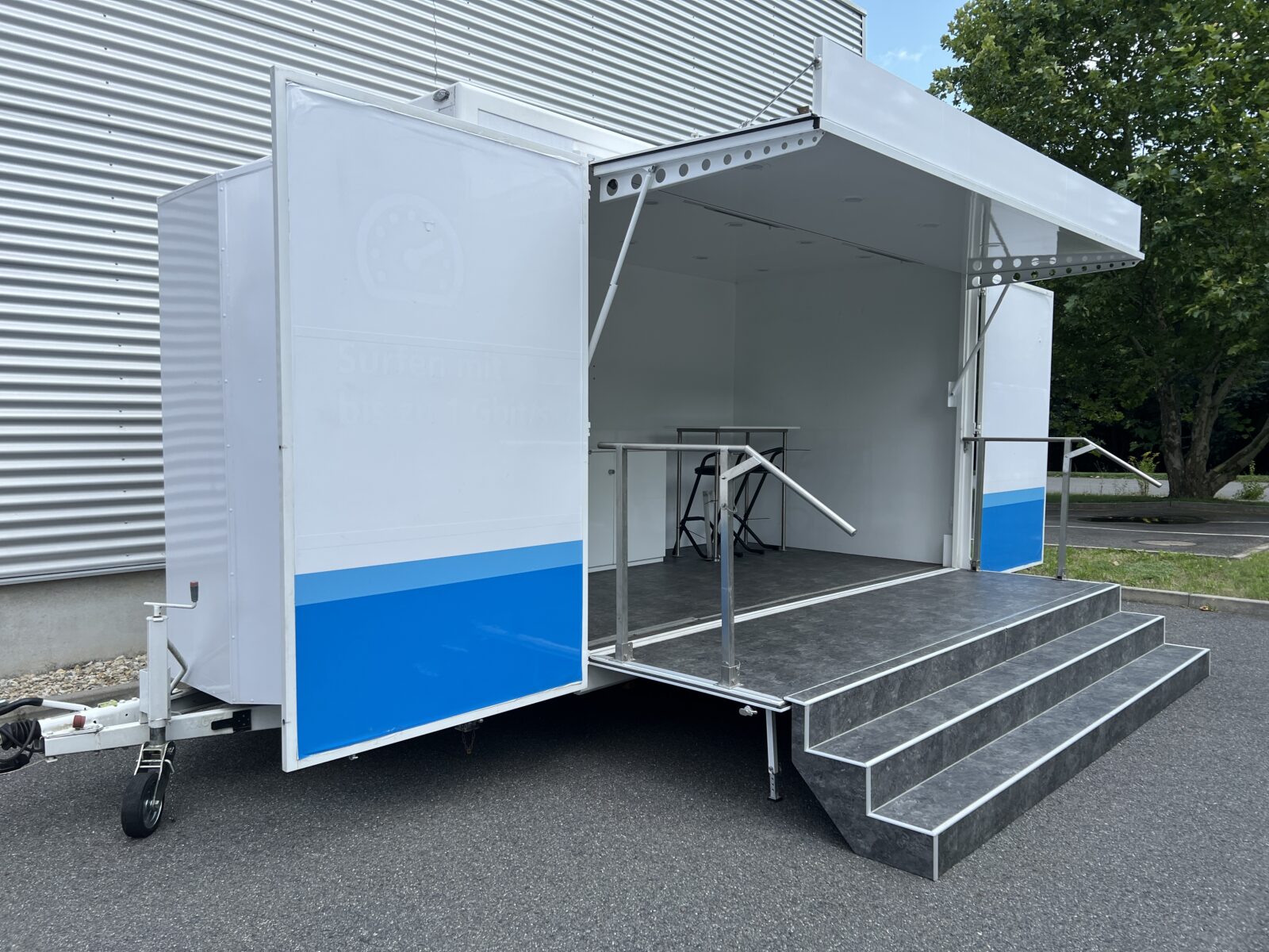 Prezentační přívěs EXPO je klasickou podobou mobilních reklamních stánků. Rychlá instalace cca 20 minut, nabízí jasnou výhodu pro roadshow, s možností více zastávek během jednoho dne. Promotion přívěs expo je možné využít nejen pro roadshow, ale i jako veletržní stánek, mobilní podium, zázemí pro akce, festivaly a pod.