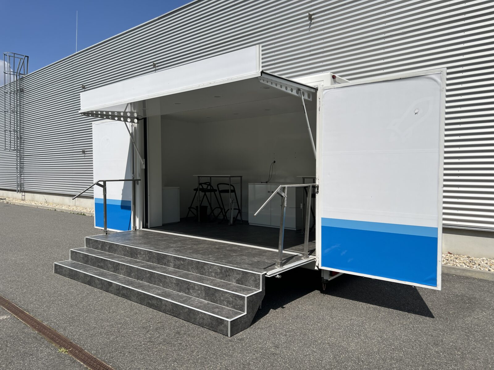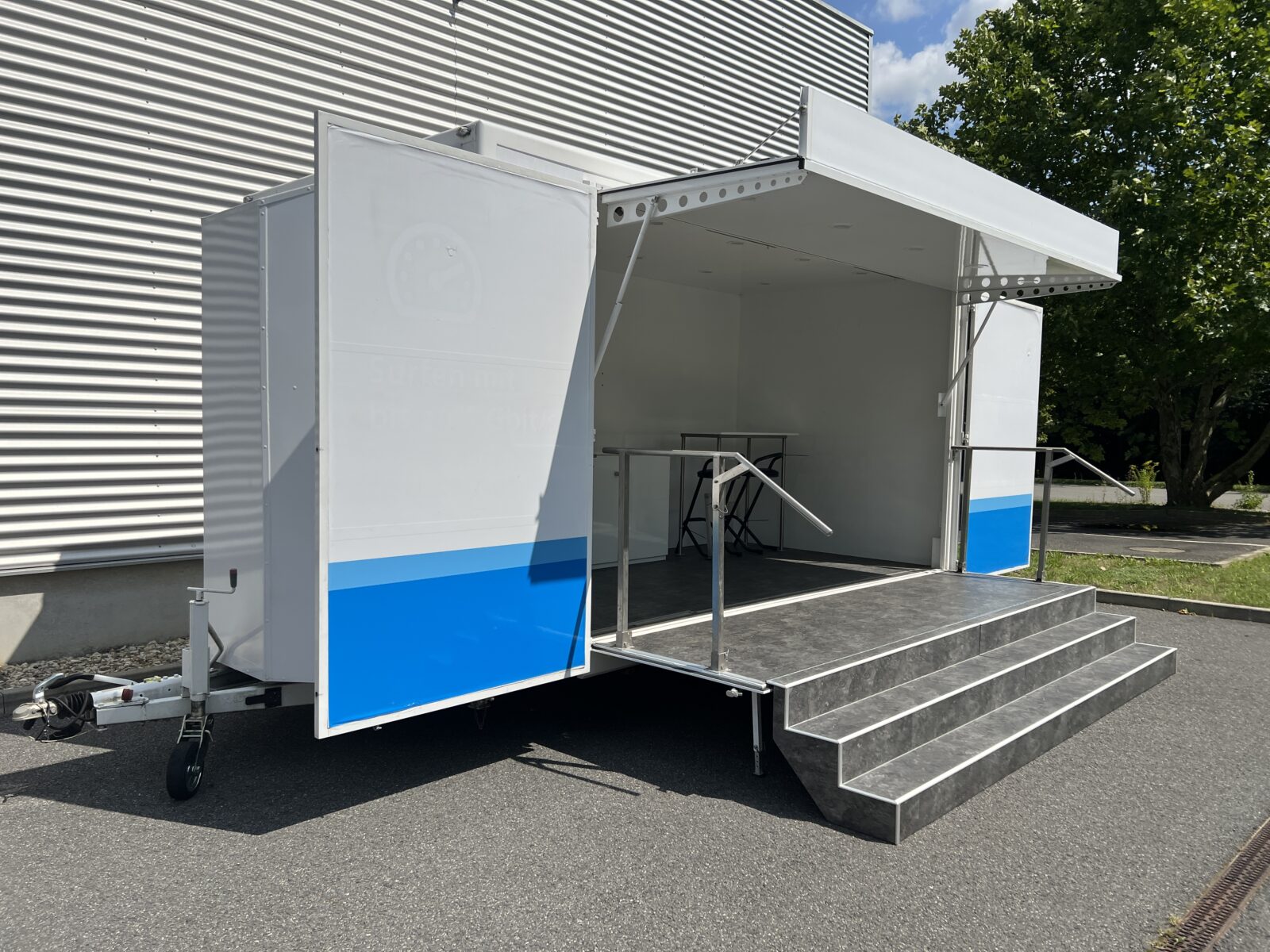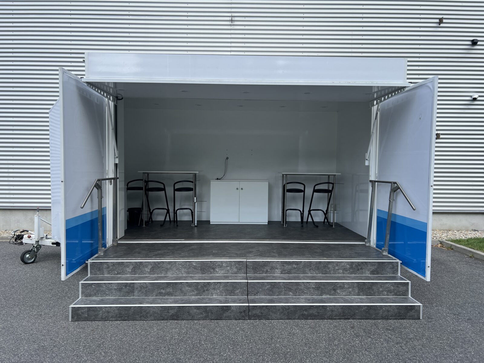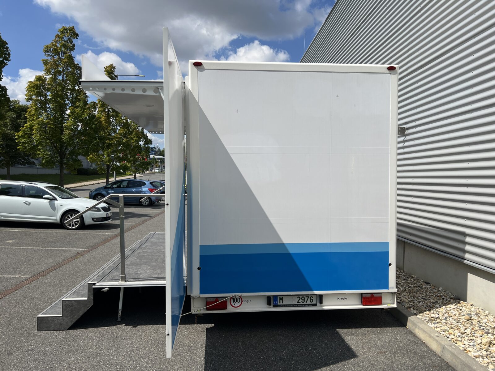 Prezentační přívěs EXPO je klasickou podobou mobilních reklamních stánků. Rychlá instalace cca 20 minut, nabízí jasnou výhodu pro roadshow, s možností více zastávek během jednoho dne. Promotion přívěs expo je možné využít nejen pro roadshow, ale i jako veletržní stánek, mobilní podium, zázemí pro akce, festivaly a pod.