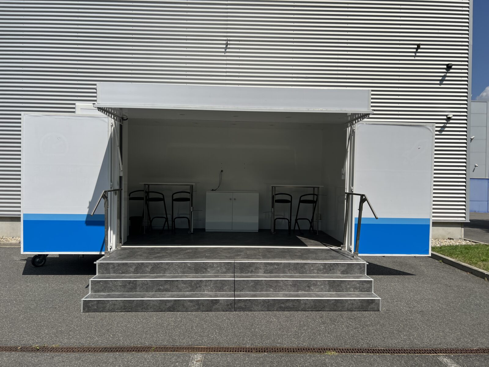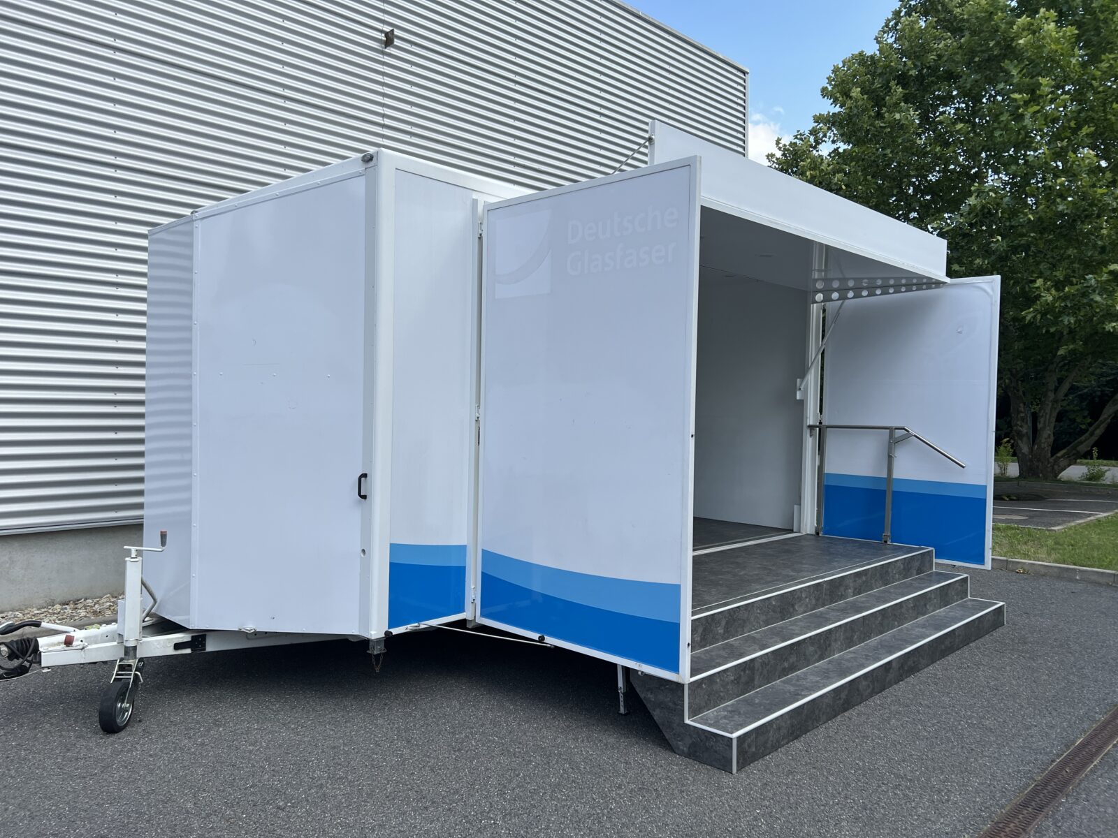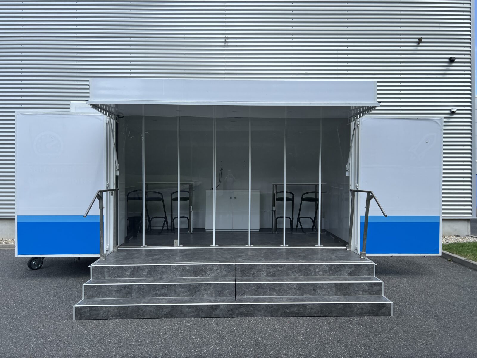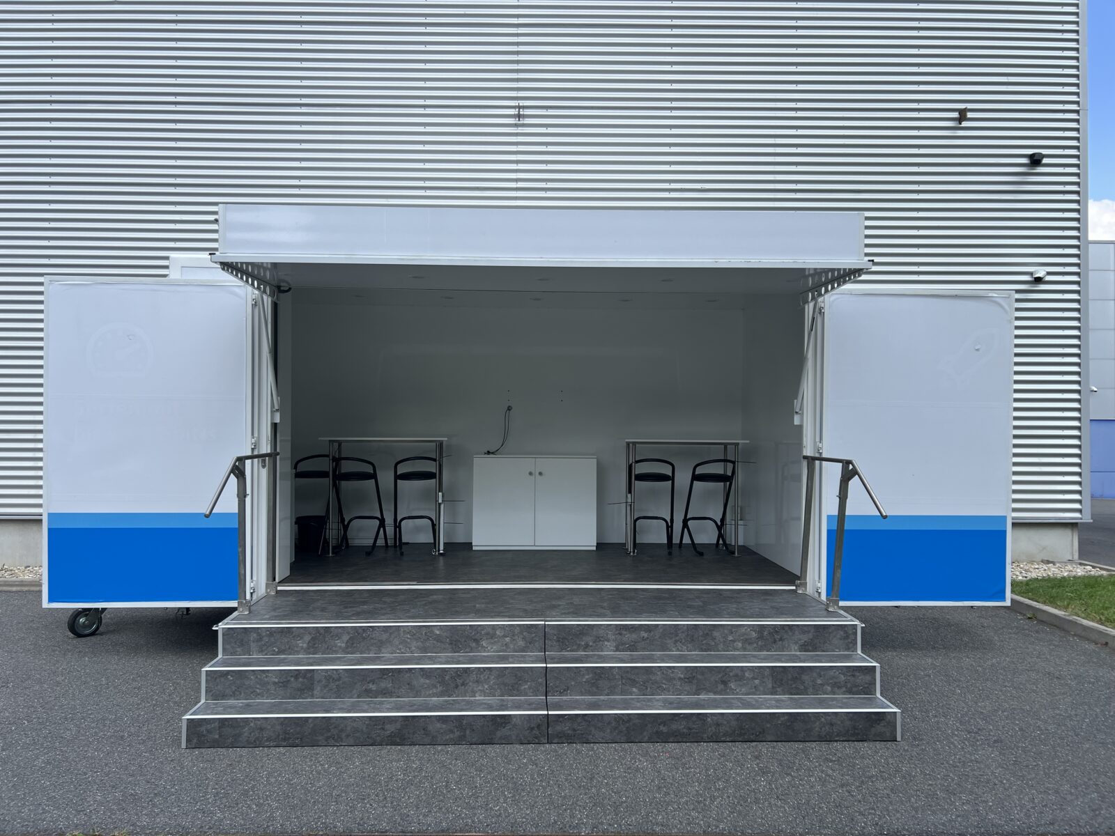 Prezentační přívěs EXPO je klasickou podobou mobilních reklamních stánků. Rychlá instalace cca 20 minut, nabízí jasnou výhodu pro roadshow, s možností více zastávek během jednoho dne. Promotion přívěs expo je možné využít nejen pro roadshow, ale i jako veletržní stánek, mobilní podium, zázemí pro akce, festivaly a pod.